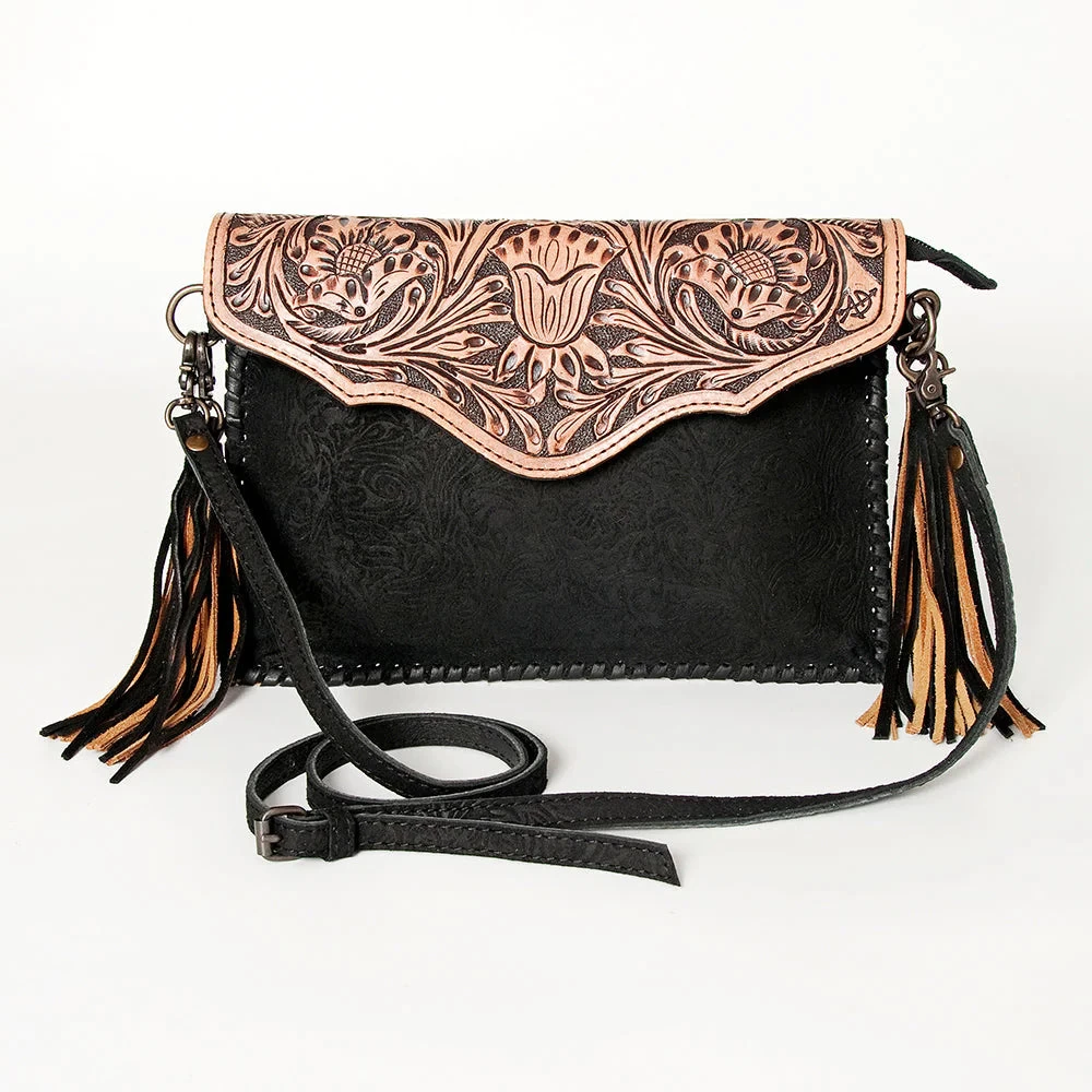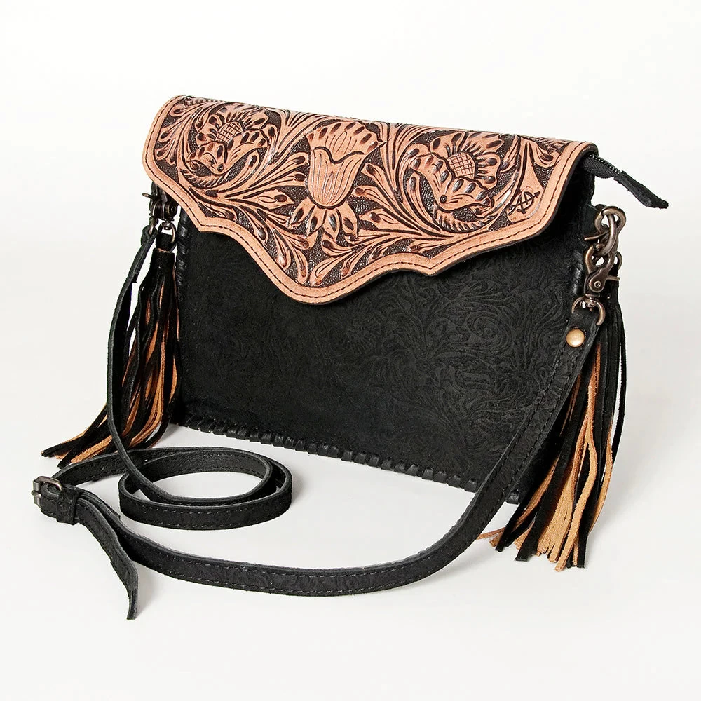 This is such a classy looking purse! The sculpted black leather with the light tan tooled leather top is a standout!!