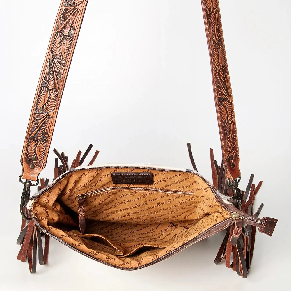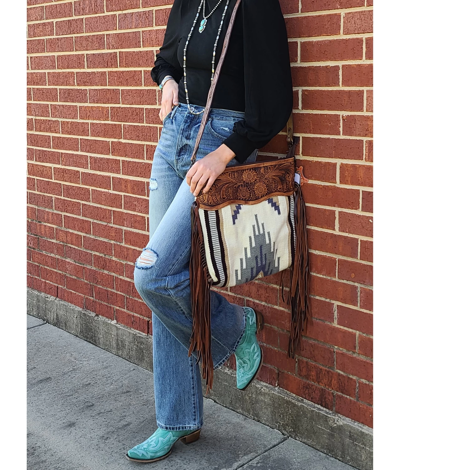 We just love this blanket crossbody with the rich dark tooled leather. The colors are simply perfect in this bag.Â