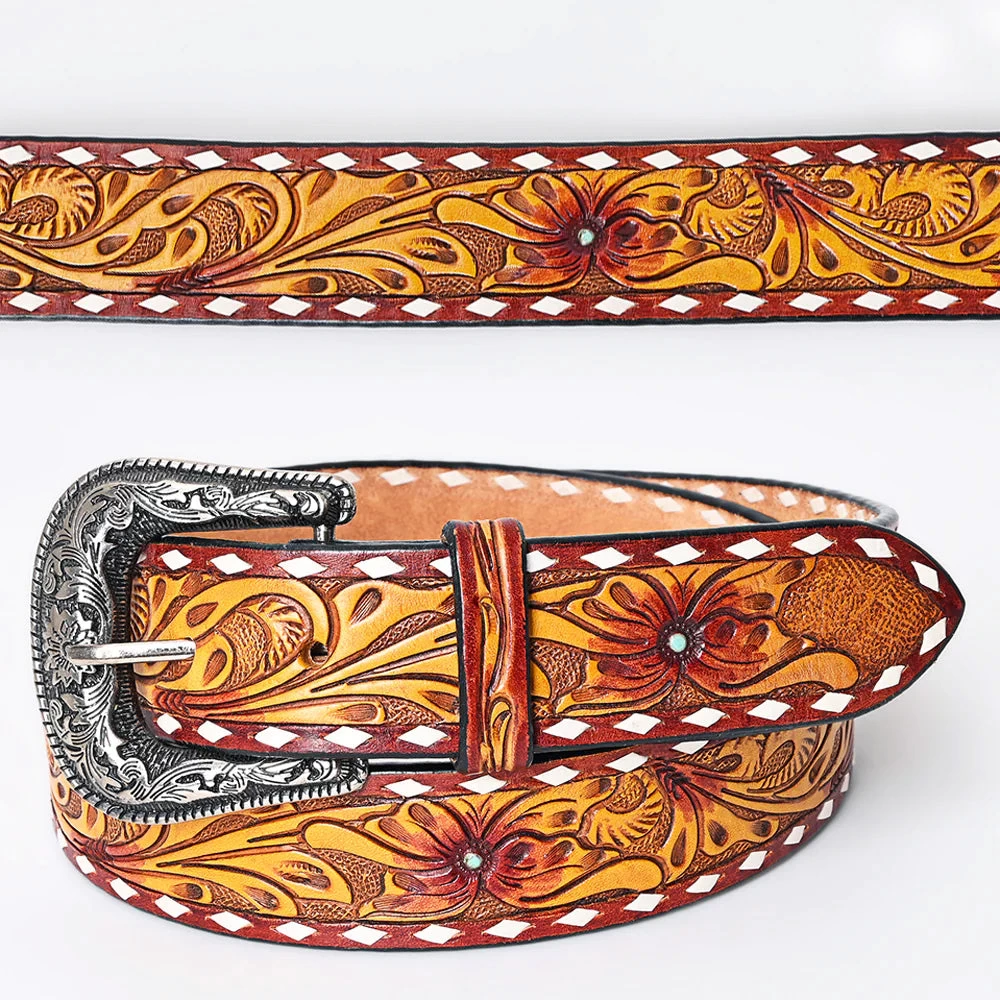 Look at this beautiful American Darling Belt! It is a floral tooled leather with yellow & burnt orange and white buckstitch.Â
