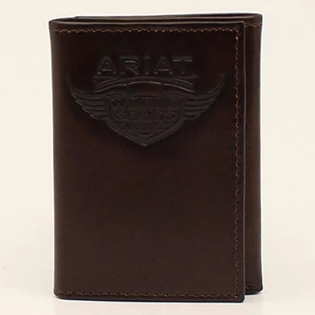 This wallet is made of genuine leather and features stained edges and deboss Ariat world series logo at the top. Inside features a clear ID slot, credit card slots, removable photo slip, and cash pocket.Â