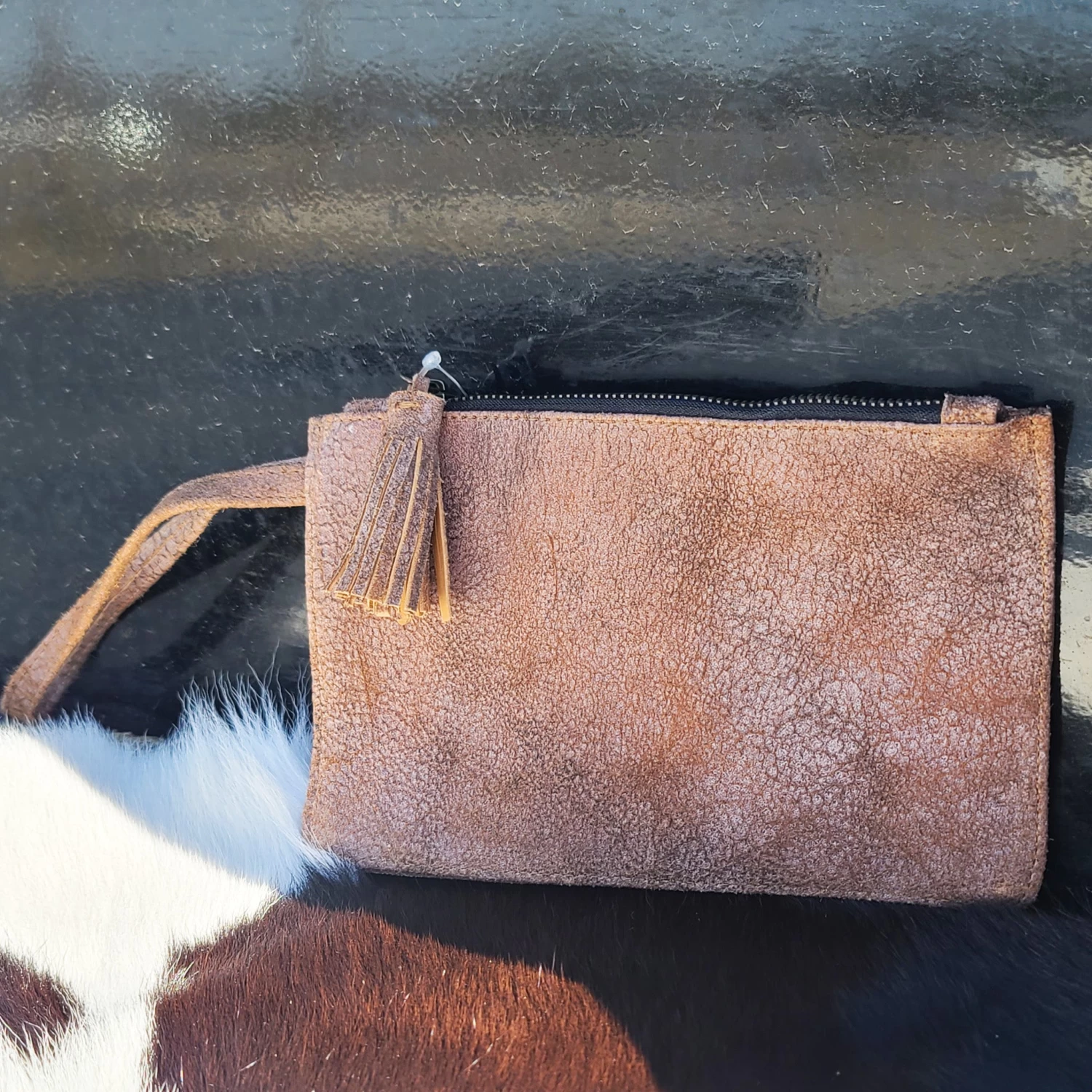 This cute and stylish leather wristlet is perfect for putting in those few cards and lip-gloss for a night out. Sure to dress up any outfit it is paired with.Â