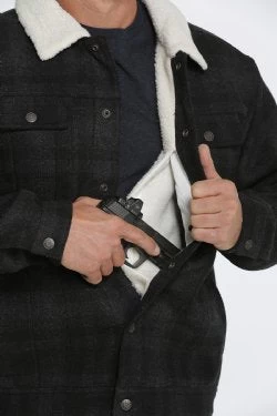 Keep warm and on your game at the ranch or the range wearing our black poly-wool concealed carry trucker jacket.Â