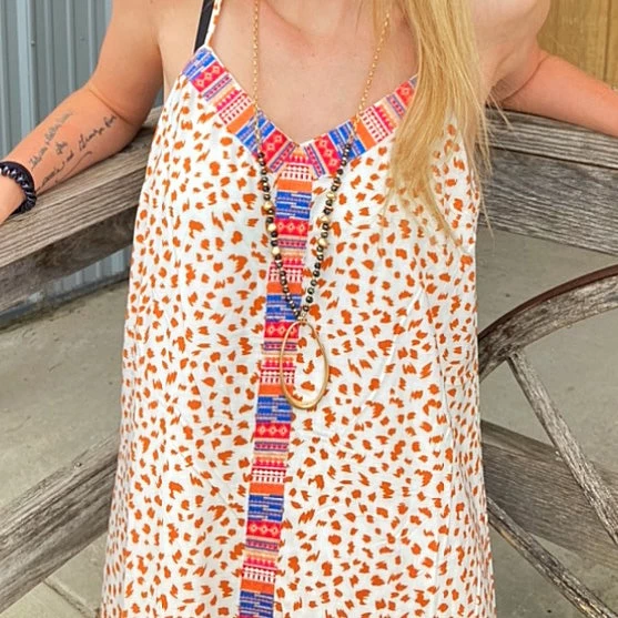 This long summery dress is perfect for those casual yet dressy occasions! The Aztec embroidery on the front of the dress and neckline adds just the right amount of color to make this dress even more summery!