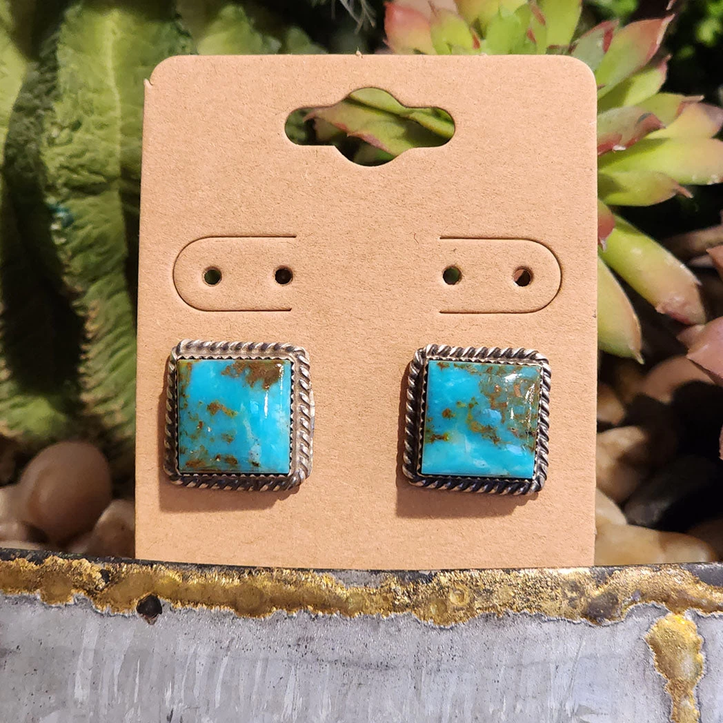 These are a eye catching pair of Kingman turquoise square studs. These studs will be a pair you reach for all the time.Â