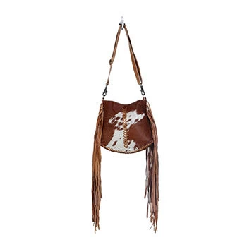 This shoulder bag is upcycled from cowhide. The combination of white and brown hairon along with the fringes gives it a very attractive look.