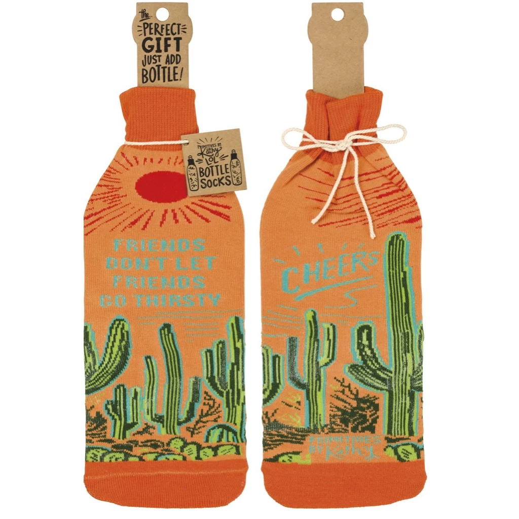 The Bottle Sock is a fun and creative gift idea! The “Friends Don’t Let Friends Go Thirsty – Cheers” knit bottle sock with cacti and sun designs throughout. It is also great as a decorative accent on an empty bottle!Â