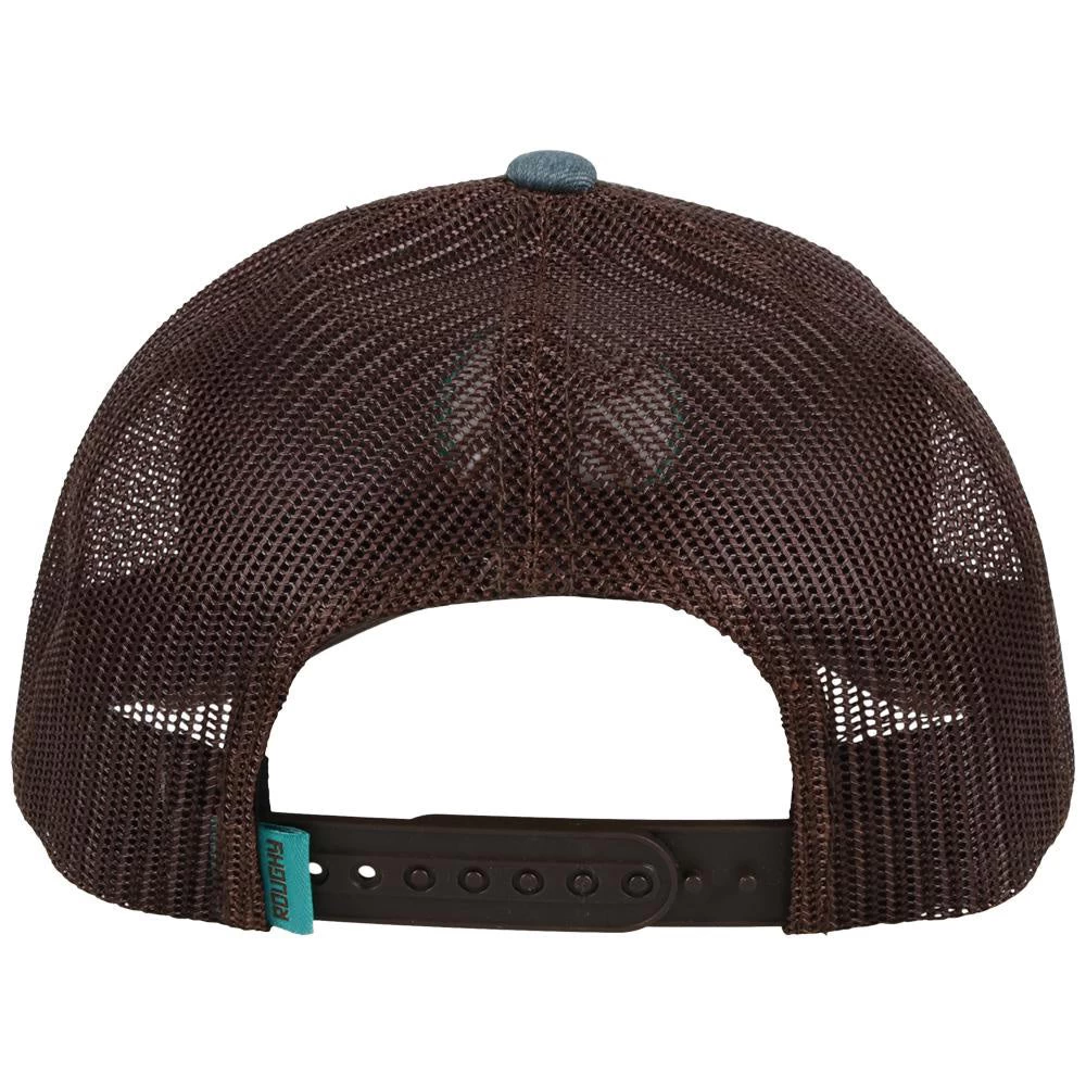 This great looking cap is offered in a mid-profile 6-panel body with a curved bill. Solid denim front with brown mesh back for ventilation. There is a contrasting ROUGHY tag attached to an adjustable backstrap for fit. The puffed brown embroidery ROUGHY O patch stands in a turquoise Hooey O!