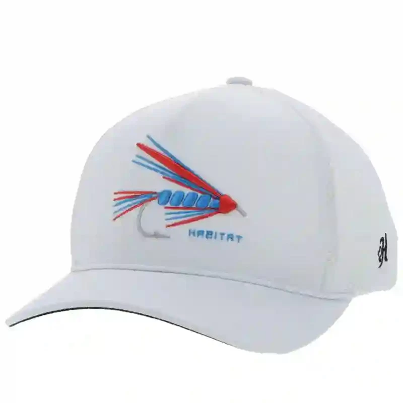 For all of you fly fishing fans! A mid-profile white cap with a curved bill. Perfect for those sunny days, this cap is made with Odessa Fabric which will resist sweat rings. It has an adjustable backstrap for proper fit and a colorful hook front and center! The back panels are made of white mesh for good ventilation.Â