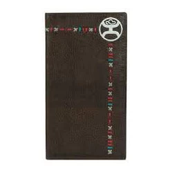 This chocolate checkbook cover shows off a waxed cord stitched border of red, turquoise, and cream. A 3D Hooey man jumps out of the right top corner.