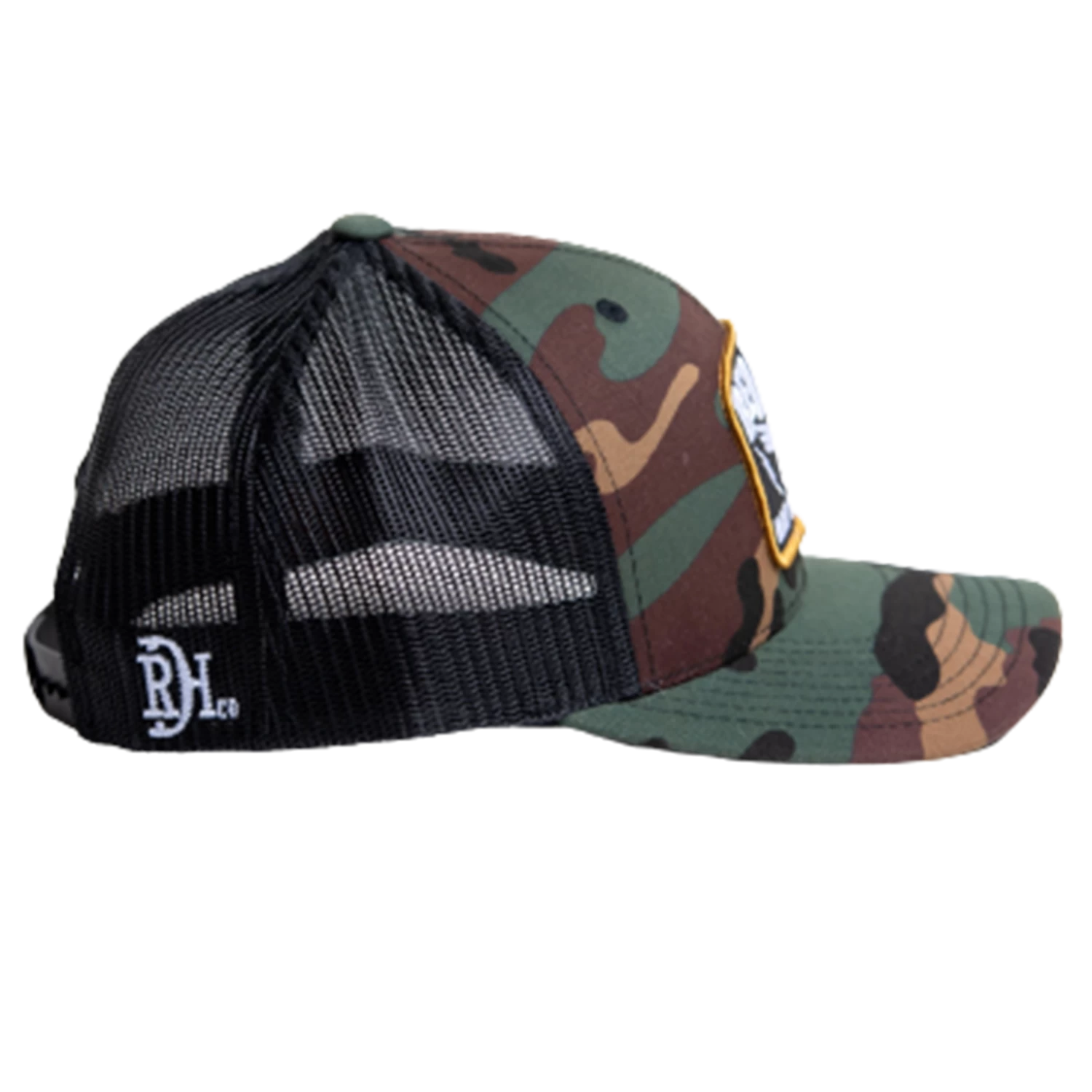 This Red Dirt Camo & Black 6 panel style snapback cap features the “Thunderstruck” patch.