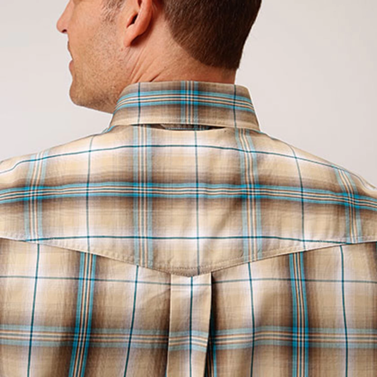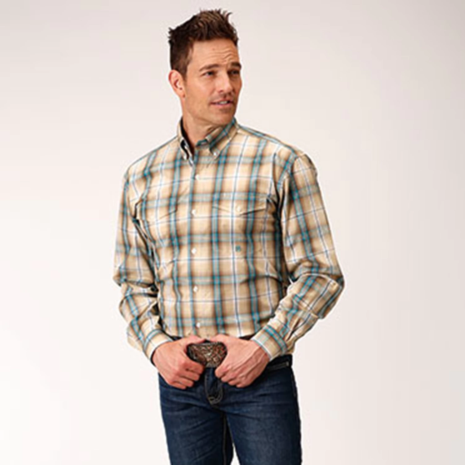 This khaki blue and tan plaid long sleeve from Roper is perfect for wearing to church on Sunday or durable enough to take on whatever work comes your way. It features a back yoke with pleat and locker loop, has buttons down the front, on the cuffs, and the collar. It has two front pockets, with the left front chest featuring the famous Roper “R” brand embroidered on it.Â