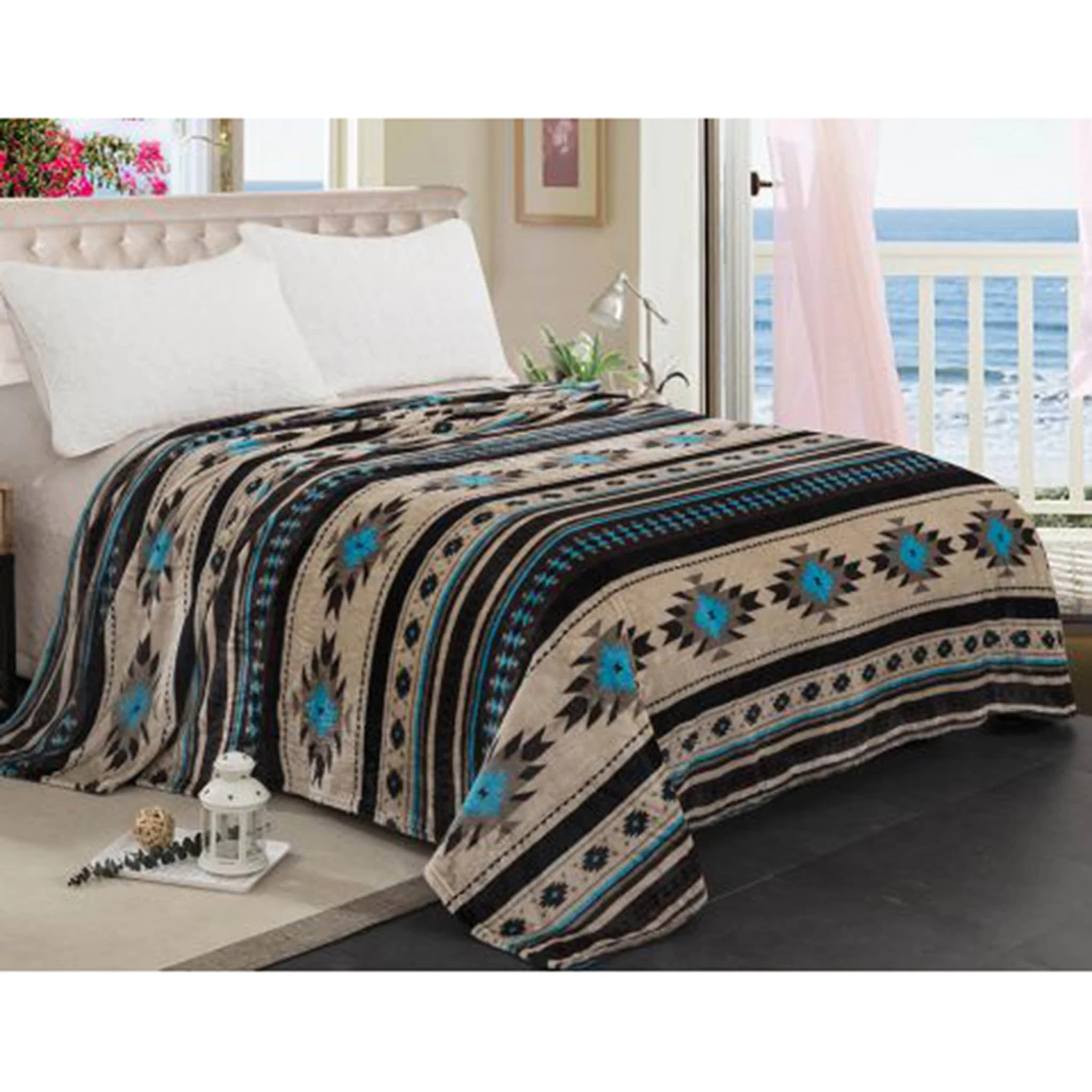 This Southwest silk blanket features a tan and turquoise print and has the softest feel, which makes this blanket the perfect choice to cuddle up with at night.Â