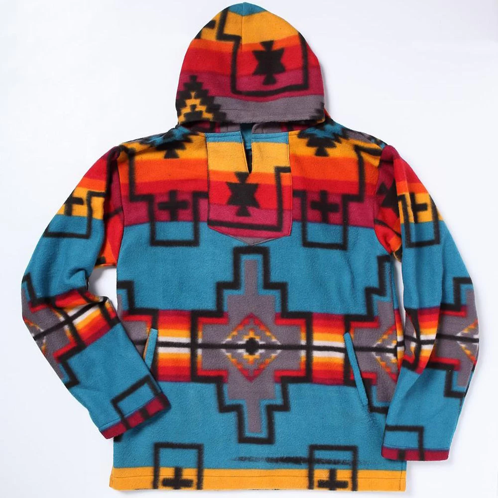 This fleece hoodie would look great on anyone! The bright colored aztec designs add just the right amount of character and the hand pockets are sure to keep you warm!