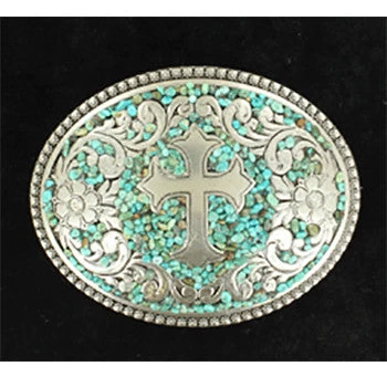 Dress up your favorite belt with this beautiful Nocona buckle by M&F Western Products®.  Oval silver buckle with silver floral beaded trim. Silver center cross design with floral border, crystal accents and turquoise beaded background.  Measures 3-1/4″ x 3-3/4″.