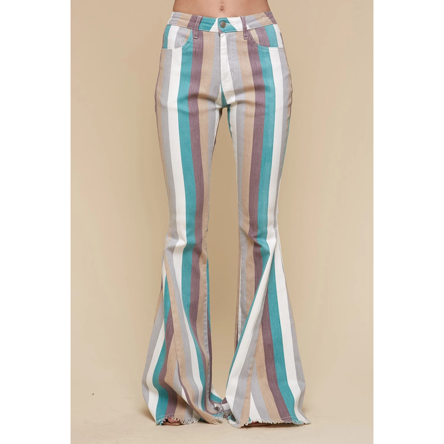 Who doesn’t love a great pair of jeans. You get color and flare with these high waisted bell bottom jeans. The bottom of the jean has fringe detail adding to the whole look.