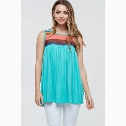 This women’s tank features a bright turquoise color on the body. The shoulders are a crotchet material of all sorts of western colors!Â