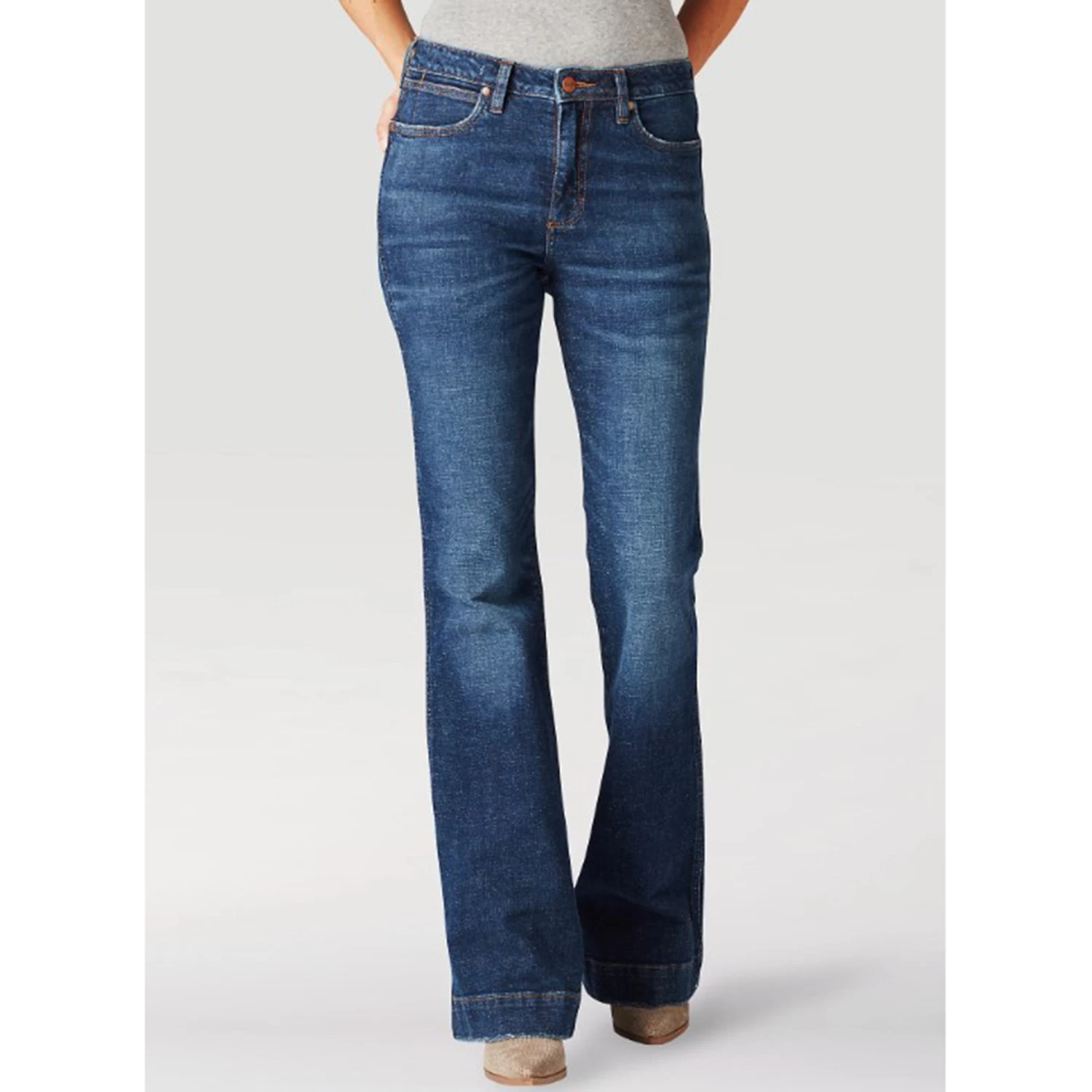Traditional 5-pocket styling with classic Wrangler ‘W’ on back pockets. Zipper fly with button front closure. This style offers a close fit through the thigh before releasing at the knee to a subtle, wide-leg opening that fits perfectly around your favorite cowgirl boots and Western-inspired heels.